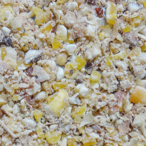 とうもろこし、マイロ、大豆油かす、なたね油かす、(コーングルテンミール)、とうもろこしジスチラースグレインソリュブル、米ぬか油かす、ふすま、魚粉、(ポーク・チキン原料混合ミール)、炭酸カルシウム、動物性油脂、リン酸カルシウム、食塩、イソマルトオリゴ糖シロップ、(アルファルファミール)