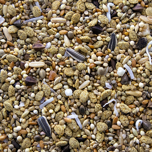 ヒエ(皮付き)、アワ(皮付き)、ペレットM(キビ、カナリアシード、アワ、大豆、ピーナッツパウダー、コーングルテンミール、脱脂大豆、ブドウ糖、リンゴ、バナナ、ブドウ、パン酵母、乳酸菌(フェカリス菌)、ミネラル類(第二リン酸カルシウム、炭酸カルシウム、食塩、塩化カリウム、硫酸亜鉛、硫酸マンガン、硫酸銅、硫酸コバルト、ヨウ素酸カルシウム)、アミノ酸類(塩酸L-リジン、DL-メチオニン)、ビタミン類(コリン、ナイアシン、E、C、パントテン酸、イノシトール、A、B6、B2、B1、葉酸、K、ビオチン、B12、D3))、キビ(皮付き)、カナリアシード(皮付き)、ペレットS(キビ、ヒエ、カナリアシード、アワ、大豆、ピーナッツパウダー、ブドウ糖、脱脂大豆、卵黄粉末、パン酵母、乳酸菌(フェカリス菌)、ミネラル類(第二リン酸カルシウム、炭酸カルシウム、食塩、塩化カリウム、硫酸亜鉛、硫酸マンガン、硫酸銅、硫酸コバルト、ヨウ素酸カルシウム)、アミノ酸類(塩酸L-リジン、DL-メチオニン)、ビタミン類(コリン、ナイアシン、E、C、パントテン酸、イノシトール、A、B6、B2、B1、葉酸、K、ビオチン、B12、D3))、オーツ麦(皮むき)、ソバ、あさの実、ヒマワリ、アワ(皮むき)、パパイヤ、リンゴ、ボレー粉、ココナッツ、シトラスオイル