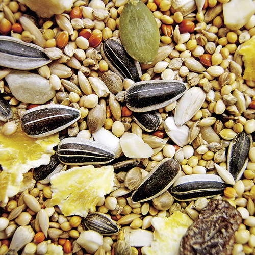 アワ(皮付き)、ヒマワリ、キビ(皮付き)、ヒエ(皮付き)、カナリアシード(皮付き)、オーツ麦(皮むき)、サフラワー、赤アワ(皮付き)または赤キビ(皮付き)、圧ペントウモロコシ、麻の実、アーモンド、パイン、パンプキンシード、レーズン、リンゴ