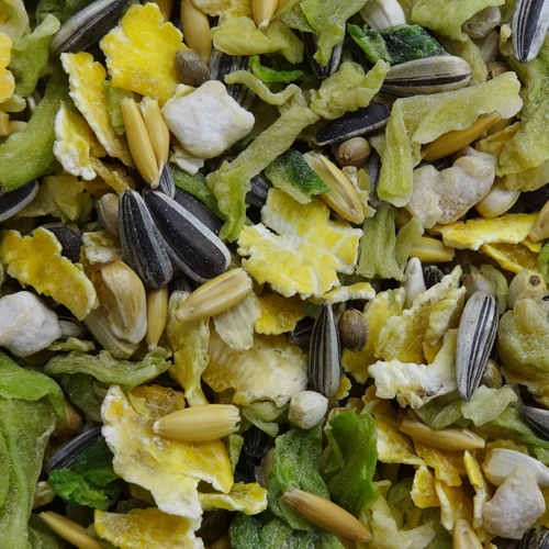圧ペントウモロコシ、小粒ヒマワリ、サフラワー、キャベツ、オーツ麦(皮付き)、あさの実、リンゴ